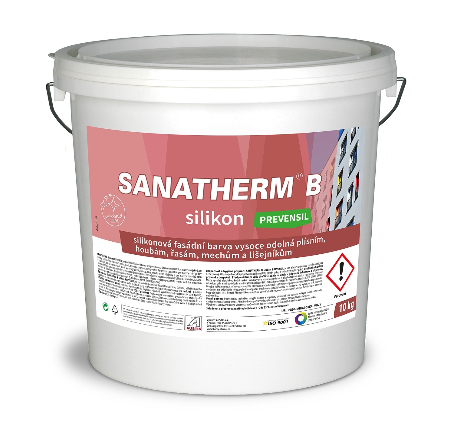SANATHERM B silikon PREVENSIL je určen zejména pro venkovní použití speciálně na fasády domů, u kterých je nebezpečí napadení houbami, plísněmi anebo řasami, tj. fasády v oblastech, kde se toto napadení vyskytuje, případně jsou v blízkém kontaktu se vzrostlou zelení a fasády, které byly biotického napadení zbaveny. SANATHERM B silikon PREVENSIL je určen pro povrchovou úpravu vápenných, vápenocementových, cementových omítek, akrylátových, silikátových a silikonových šlechtěných omítek a nátěrů a dalších podkladů jako jsou cihly, stavební kámen apod. Je vhodný pro nátěry fasád, které musí zajistit odvětrání většího množství vodních par. Nátěry se vyznačují také vysokou odolností UV záření a povětrnostním vlivům, vodoodpudivostí, nízkou vodopropustností, velmi nízkým difuzním odporem pro vodní páru a nízkou špinivostí. Centra COLOR SYSTÉMU AUSTIS tónují do širokého výběru odstínů podle vzorkovnic CSA Anorganic, CSA Fasáda, CSA Trend, Eurotrend, RAL a dalších.