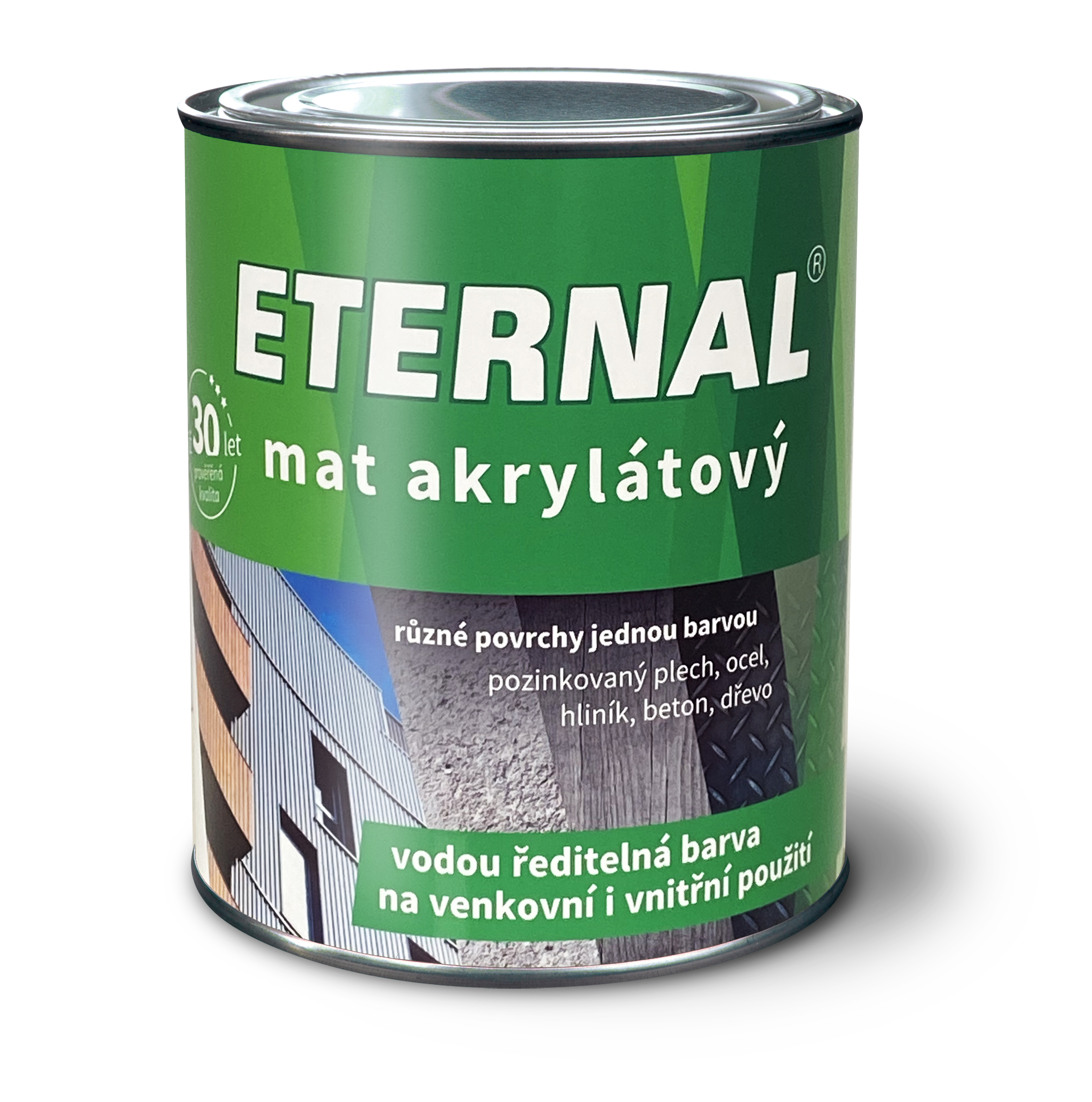 ETERNAL mat akrylátový je hedvábně matná akrylátová vodou ředitelná barva pro venkovní i vnitřní použití. Je určena k novým i udržovacím nátěrům pozinkovaného plechu (i bez předchozí oxidace), oceli opatřené antikorozním základním nátěrem, hliníku (přilnavost nutno předem ověřit). Lze jej použít i k nátěrům nepochůzného betonu, mědi, nepochůzného dřeva, neglazované keramiky a dalších stavebních materiálů. Svou kvalitou je vhodný i pro zpracování při průmyslových aplikacích. Nátěry jsou vysoce elastické, mají dlouhodobou životnost a jsou prověřené při nátěrech střešních krytin.