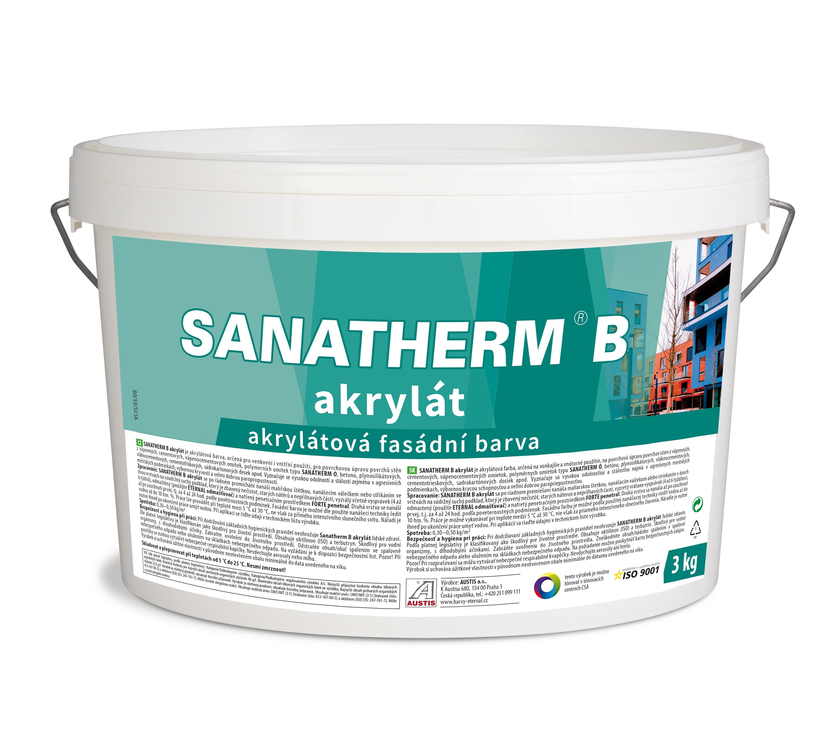 SANATHERM B akrylát je fasádní barva určena pro venkovní i vnitřní úpravy povrchů stěn z vápenných, cementových, vápenocementových omítek, polymerních omítek typu SANATHERM O, betonu, plynosilikátových, vláknocementových, cementotřískových, sádrokartonových desek apod. Používá se tam, kde se vyžaduje prodloužení životnosti stávající úpravy, zvýšení odolnosti proti vodě, UV paprskům a dalším negativním povětrnostním faktorům, snížení špinivosti a zvýšení omyvatelnosti, snížení průniku oxidů dusíku a síry do podkladové vrstvy.