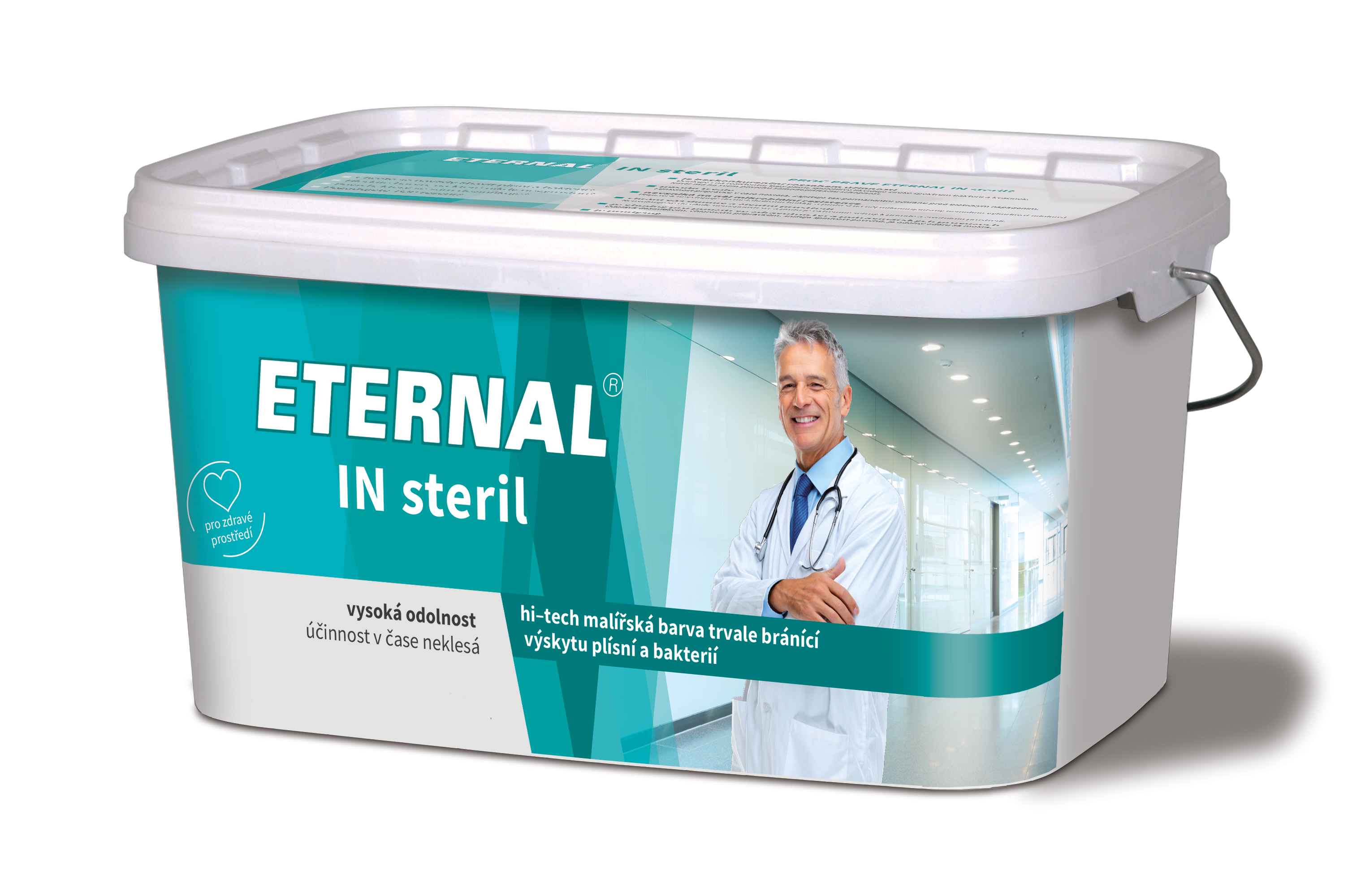 ETERNAL IN steril je bílá omyvatelná disperzní malířská barva určená k prevenci i potlačení biotického napadení stěn v interiéru plísněmi, bakteriemi a jinými mikroorganizmy. Uplatnění najde tam, kde je žádoucí maximální sterilita prostředí (operační sály, prostory v nemocnicích, potravinářské provozy, místa s vysokou vlhkostí a velkým rizikem výskytu plísní a bakterií). V domácnostech vytvoří zdravé prostředí, zejména pro alergiky a astmatiky. ETERNAL IN steril nemá žádné nebezpečné vlastnosti, neuvolňuje do okolí nebezpečné látky, nerozpouští se, tím je extrémně šetrný a řadí se mezi TOP produkty na trhu. Je paropropustný, odolný vůči oděru za mokra i sucha, vhodný pro aplikaci na sanační omítky. Je určen k použití na vápenné, vápenocementové a sádrové omítky, akrylátové omítky, beton, disperzní i silikátové nátěry, sádrokartonové, sádrovláknové, vláknocementové, cementotřískové desky i další savé podklady.