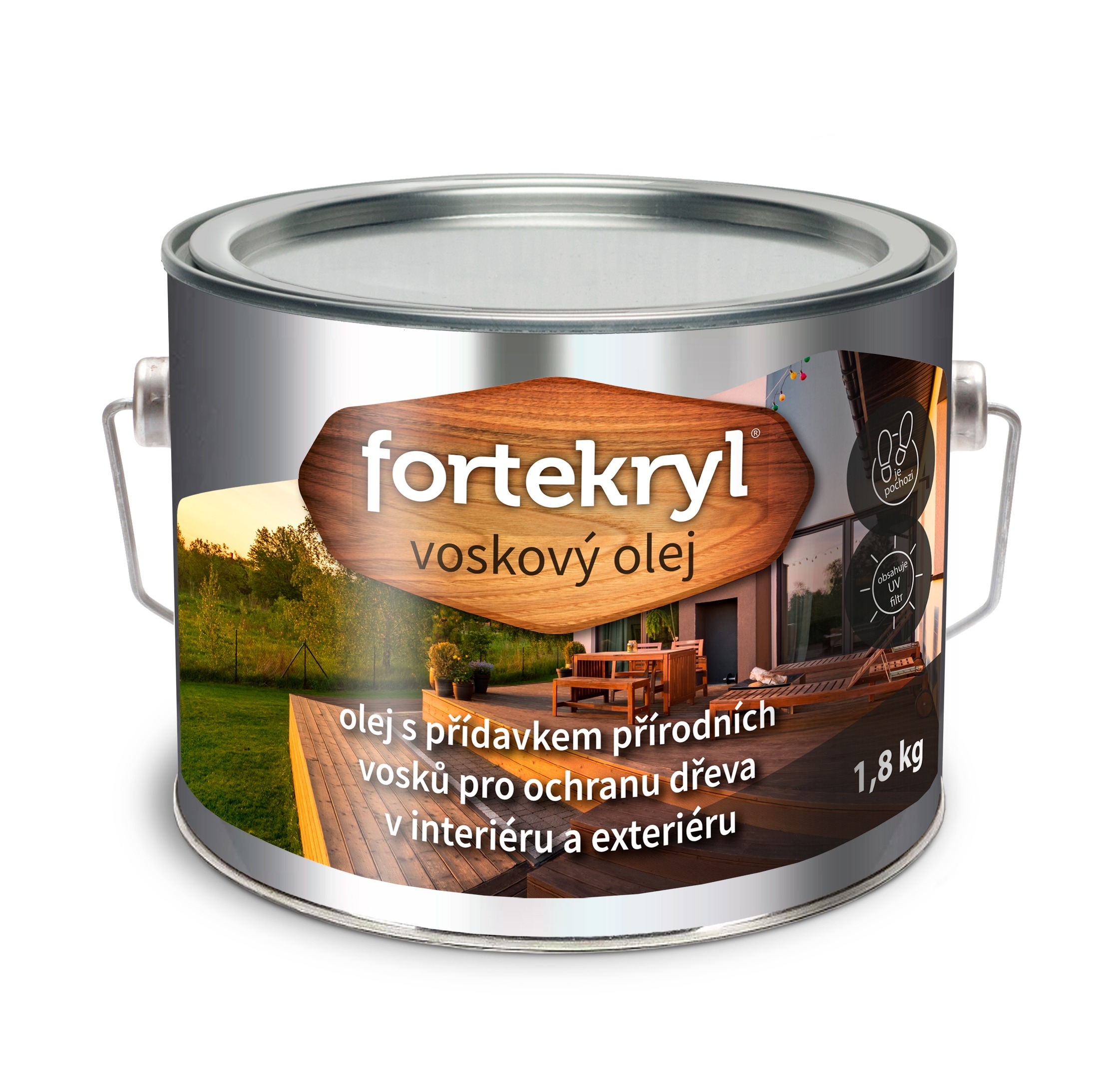 FORTEKRYL voskový olej je vodou ředitelná nátěrová hmota na bázi přírodních vosků a emulgovaného lněného oleje, obsahující velmi jemné, vysoce transparentní pigmenty a účinné UV filtry, které ochrání dřevo před povětrnostními vlivy i slunečním zářením. Nátěry vykazují trvale vysokou elasticitu a vodoodpudivost, výborné penetrační vlastnosti. Na dotyk FORTEKRYL voskový olej vytváří příjemnou, hedvábně matnou strukturu s hloubkovou ochranou dřeva. Je určen k povrchové úpravě tvrdého i měkkého dřeva, jako je například dřevěné obložení, nábytek, schodiště, trámy, stropy, ale i dřevěné terasy, pergoly, zahradní nábytek a podlahy z tvrdých nebo tropických dřevin. Bezbarvý FORTEKRYL voskový olej lze tónovat do 46 odstínů dle vzorkovnice FORTEKRYL.