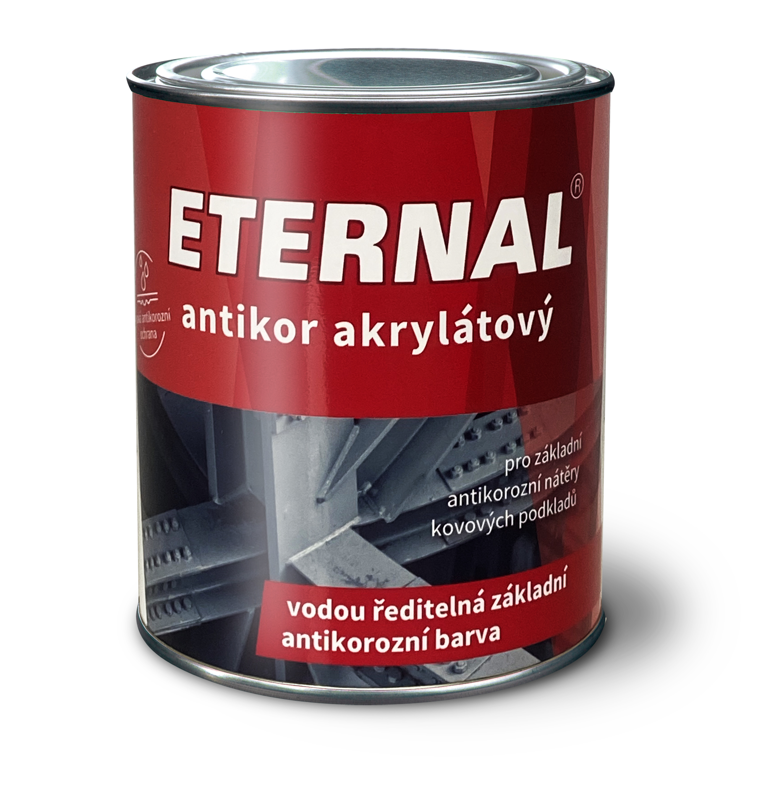 ETERNAL antikor akrylátový je určen k ochraně kovových konstrukcí proti korozi jako základní nátěr. Je vhodný i pro smíšené konstrukce, kde je ocel ve spojení s novým nezkorodovaným pozinkovaným plechem.