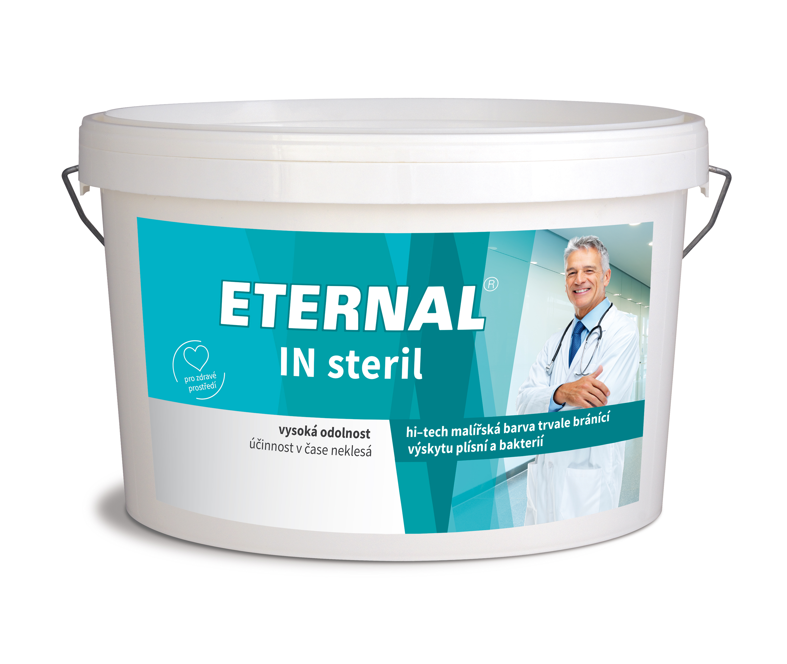 ETERNAL IN steril je bílá omyvatelná disperzní malířská barva určená k prevenci i potlačení biotického napadení stěn v interiéru plísněmi, bakteriemi a jinými mikroorganizmy. Uplatnění najde tam, kde je žádoucí maximální sterilita prostředí (operační sály, prostory v nemocnicích, potravinářské provozy, místa s vysokou vlhkostí a velkým rizikem výskytu plísní a bakterií). V domácnostech vytvoří zdravé prostředí, zejména pro alergiky a astmatiky. ETERNAL IN steril nemá žádné nebezpečné vlastnosti, neuvolňuje do okolí nebezpečné látky, nerozpouští se, tím je extrémně šetrný a řadí se mezi TOP produkty na trhu. Je paropropustný, odolný vůči oděru za mokra i sucha, vhodný pro aplikaci na sanační omítky. Je určen k použití na vápenné, vápenocementové a sádrové omítky, akrylátové omítky, beton, disperzní i silikátové nátěry, sádrokartonové, sádrovláknové, vláknocementové, cementotřískové desky i další savé podklady.